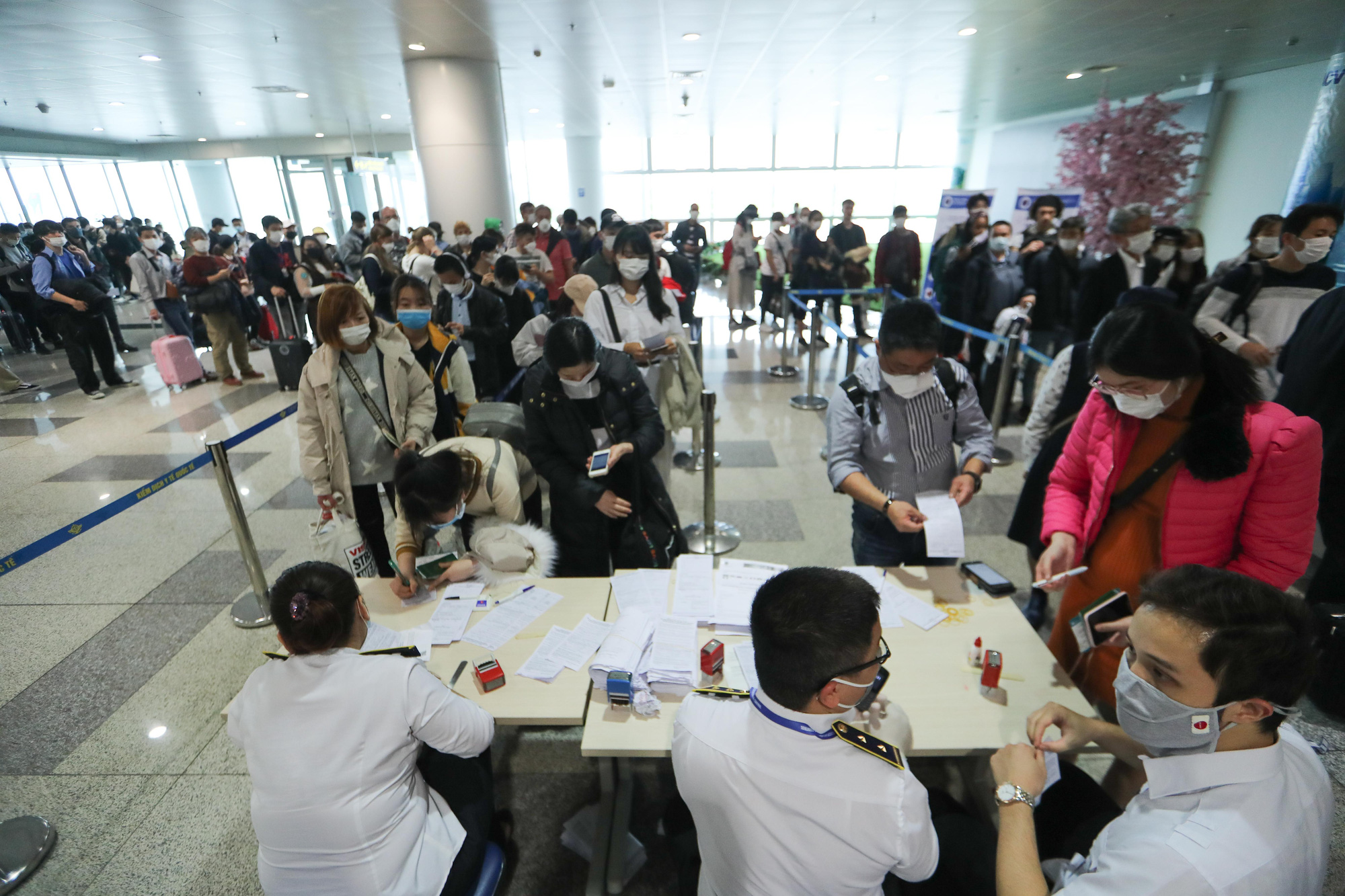 Hành khách khai tờ khai sức khỏe sau khi đến sân bay Nội Bài, Hà Nội - Ảnh: NGUYỄN KHÁNH